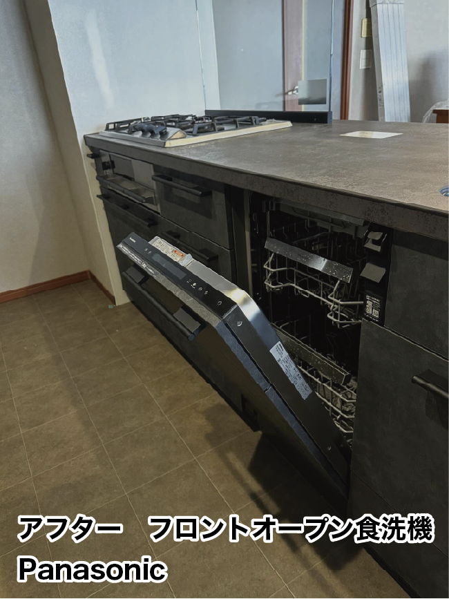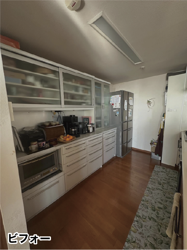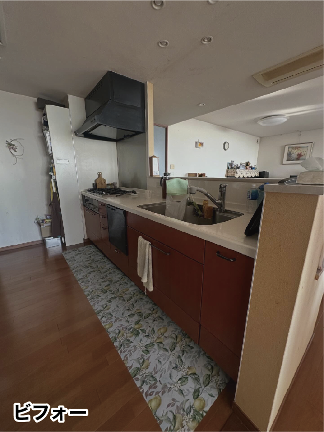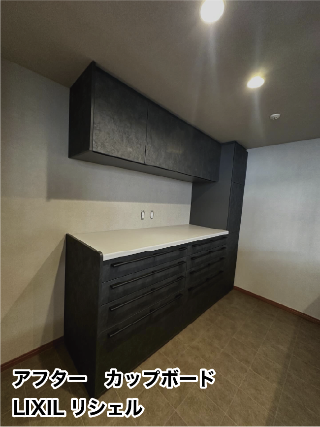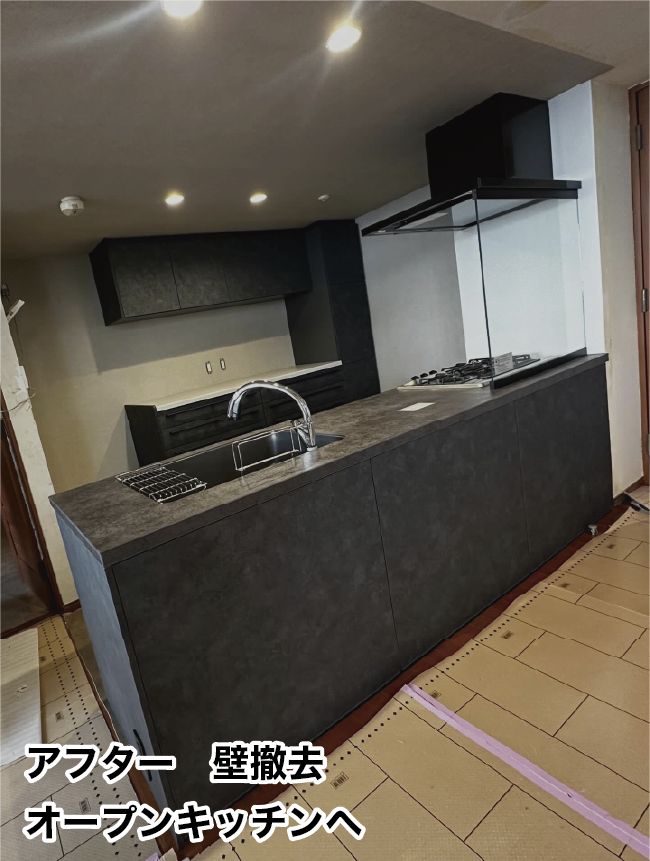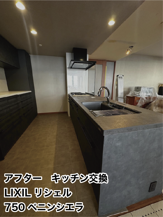 神戸市 マンションリフォーム、キッチンLIXILリシェル奥行750、カップボードLIXILリシェル、LEDダウンライト交換、壁撤去オープンキッチンへ